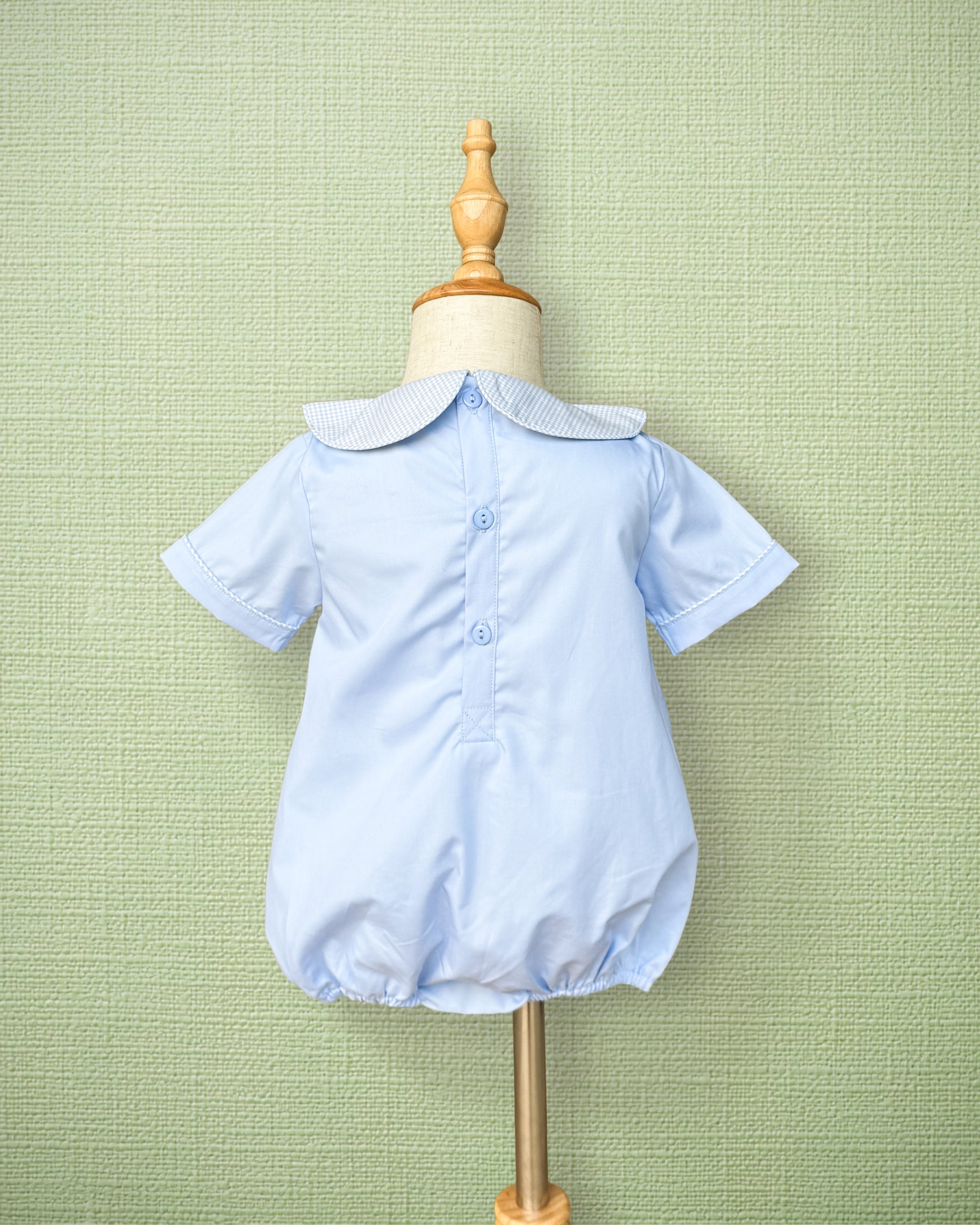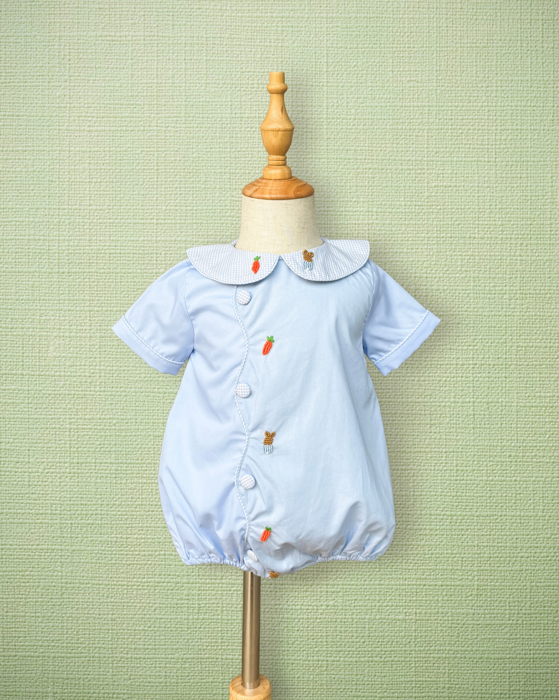 A classic spring bubble featuring delicate bunny and carrot bullion embroidery on soft blue cotton. Finished with a timeless gingham Peter Pan collar and fabric-covered buttons, this heirloom-style piece is perfect for Easter, spring outings, and portraits.