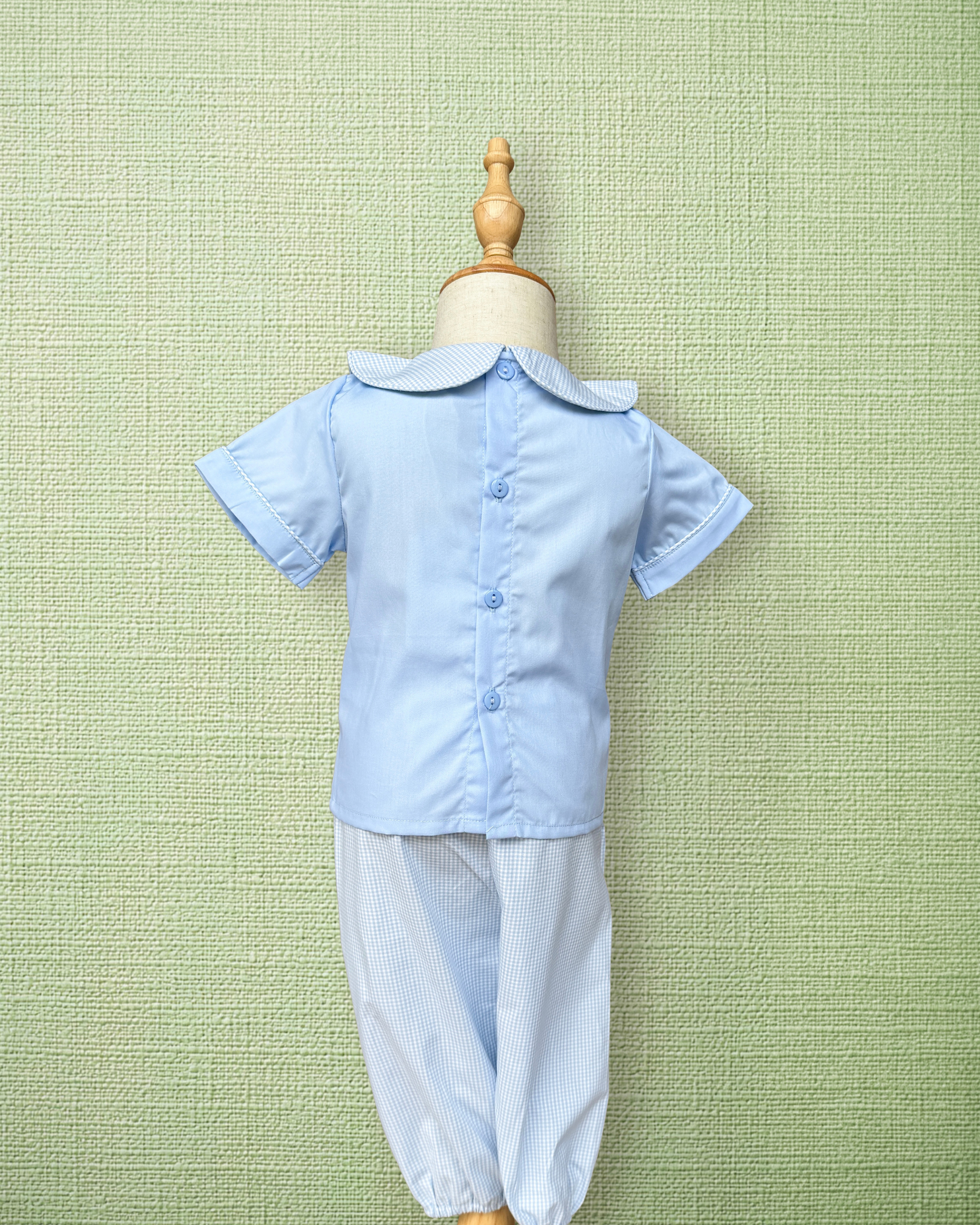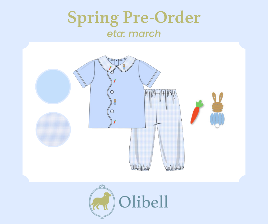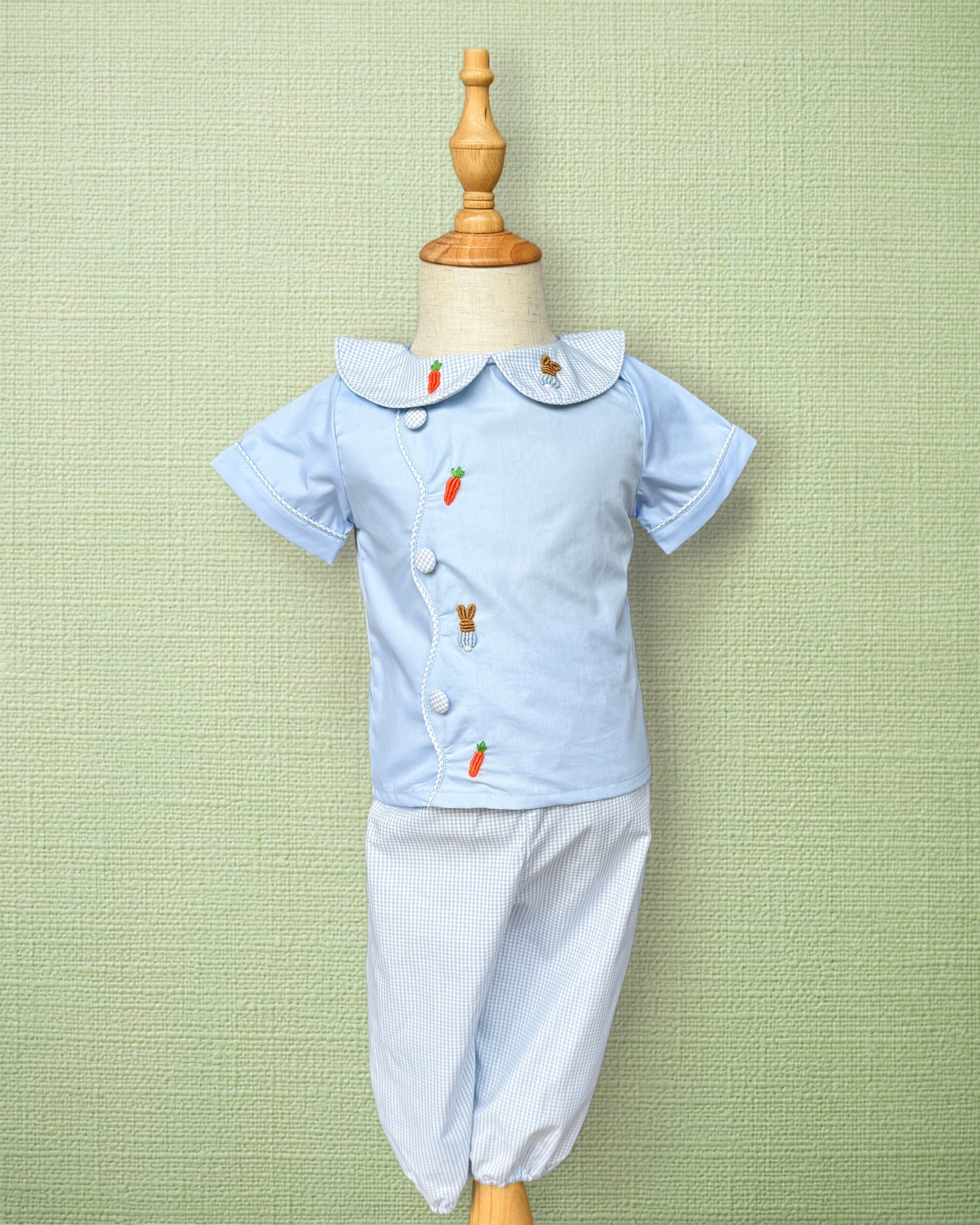 A classic spring set featuring delicate bunny and carrot bullion embroidery on soft light blue cotton. This heirloom-style two-piece includes a short-sleeve top with a timeless blue gingham Peter Pan collar, paired with coordinating light blue bubble pants. Perfect for Easter, spring outings, and portraits.