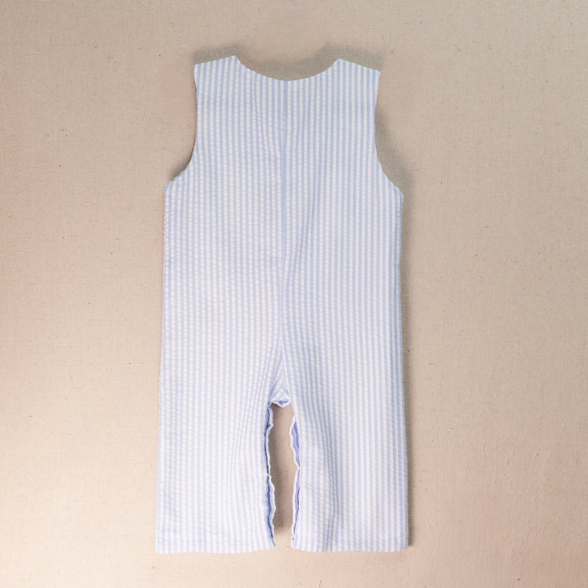 • Blue and white striped seersucker fabric with full-length legs