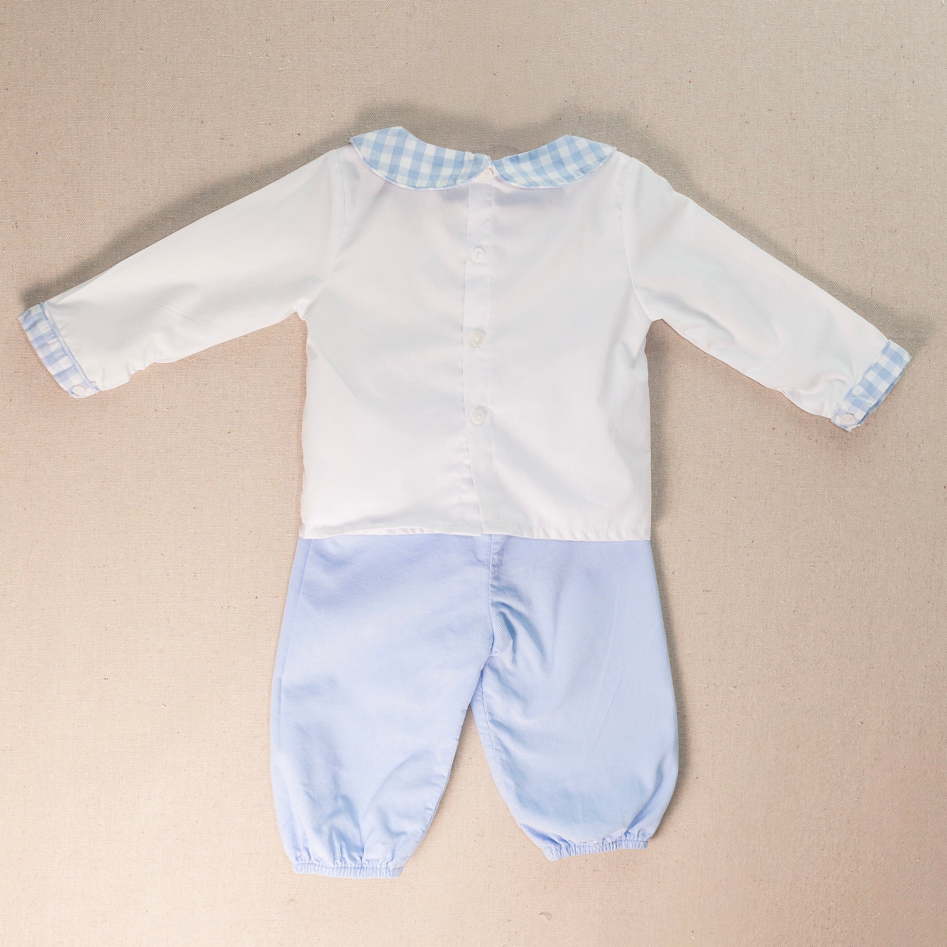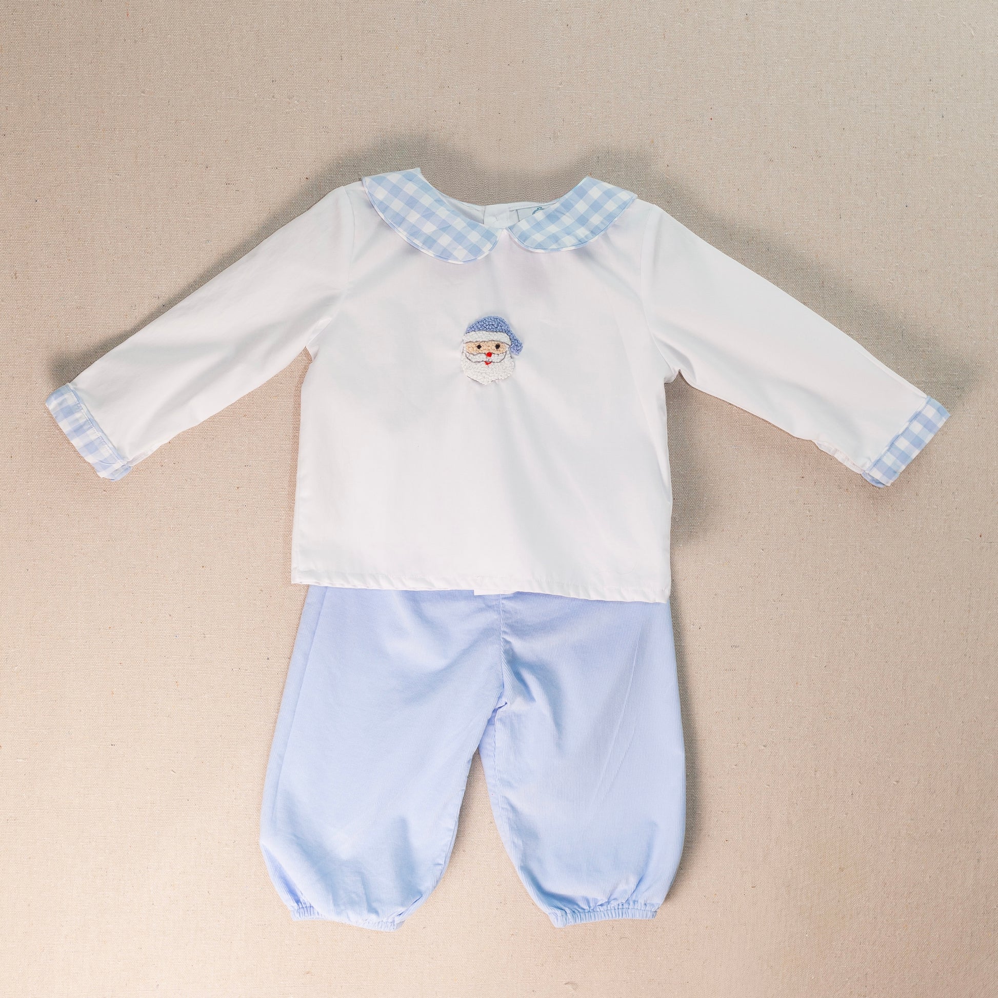 Celebrate the season in timeless Southern style with this heirloom-quality baby boy Christmas outfit. The Classic Claus Set features a crisp white long sleeve top with a hand-embroidered French knot Santa, paired with soft blue corduroy pants for a cozy, picture-perfect holiday look.