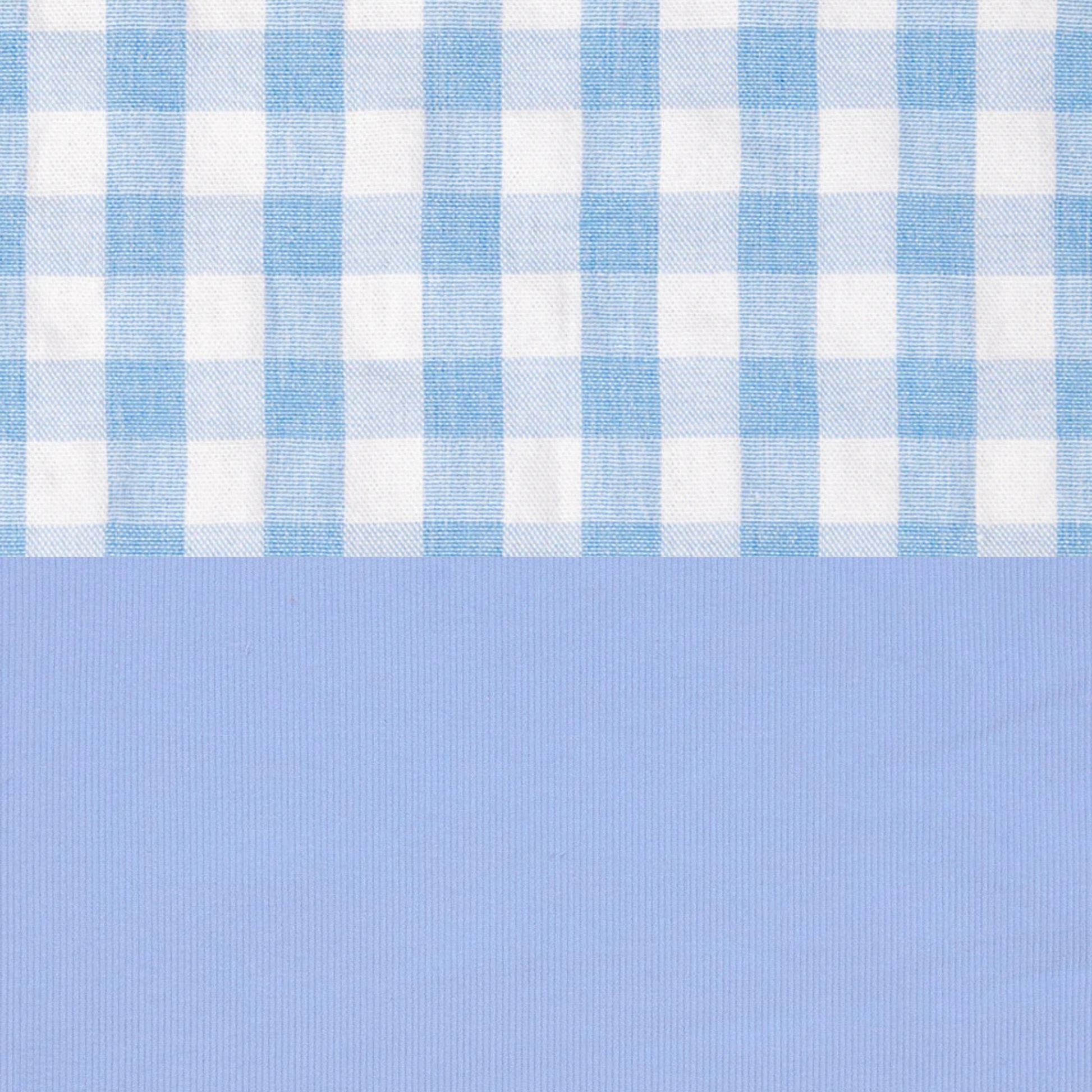• White top with blue gingham Peter Pan collar and matching sleeve cuffs