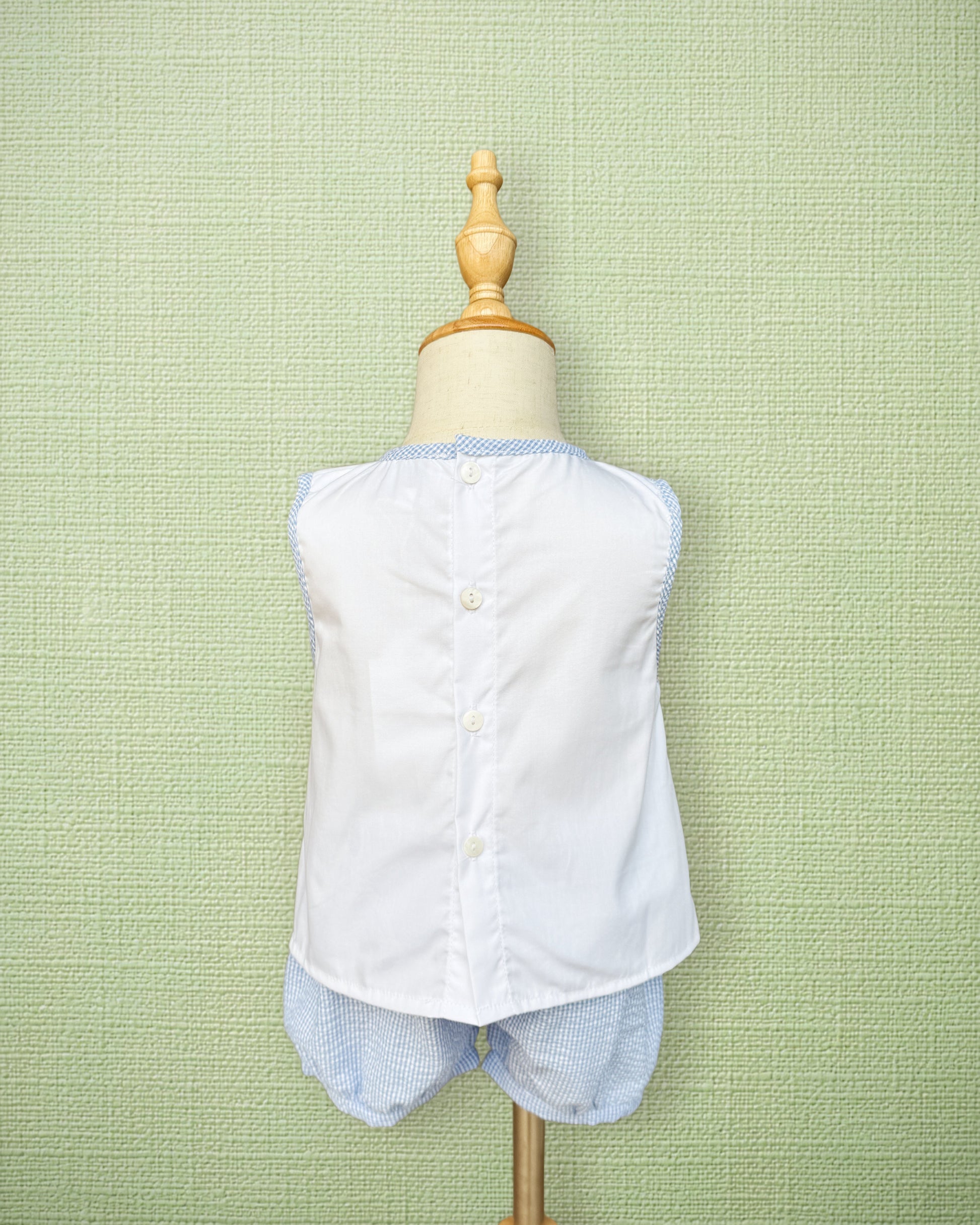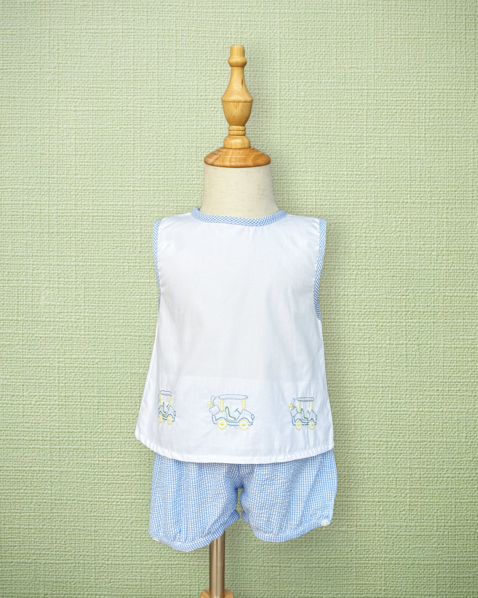A classic two-piece set featuring shadow embroidery on white cotton. This sweet spring set includes a sleeveless top with delicate golf cart shadow embroidery, paired with coordinating light blue seersucker banded shorts for a polished and playful look.
